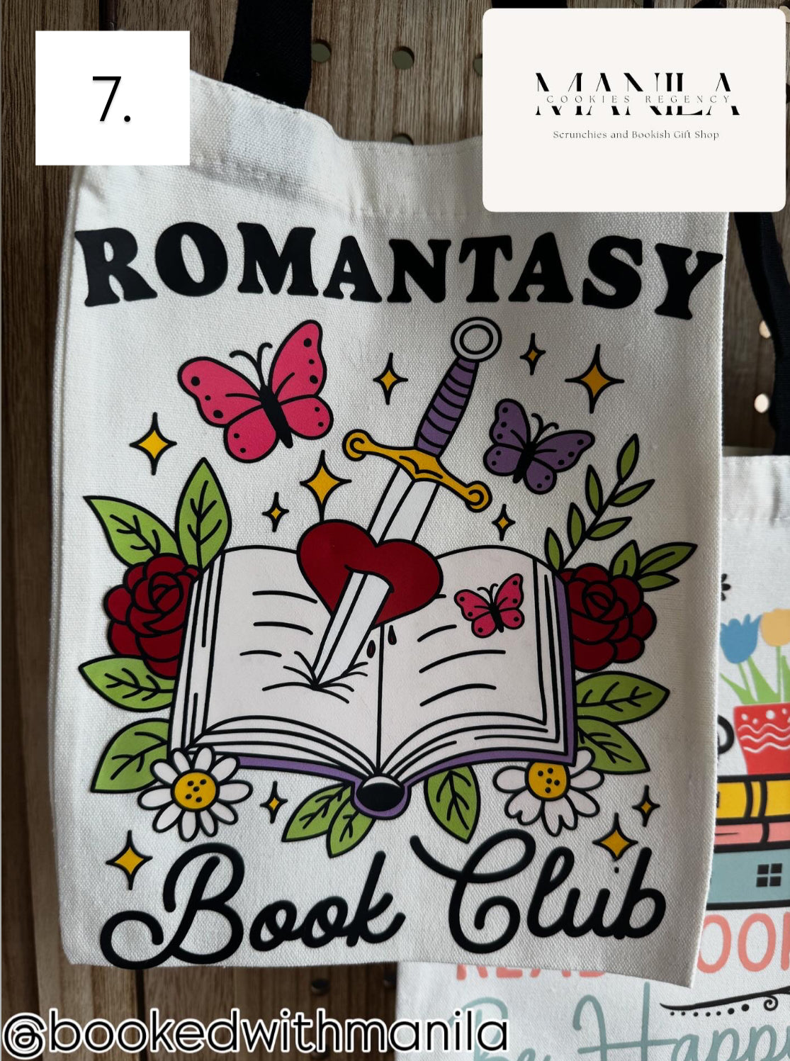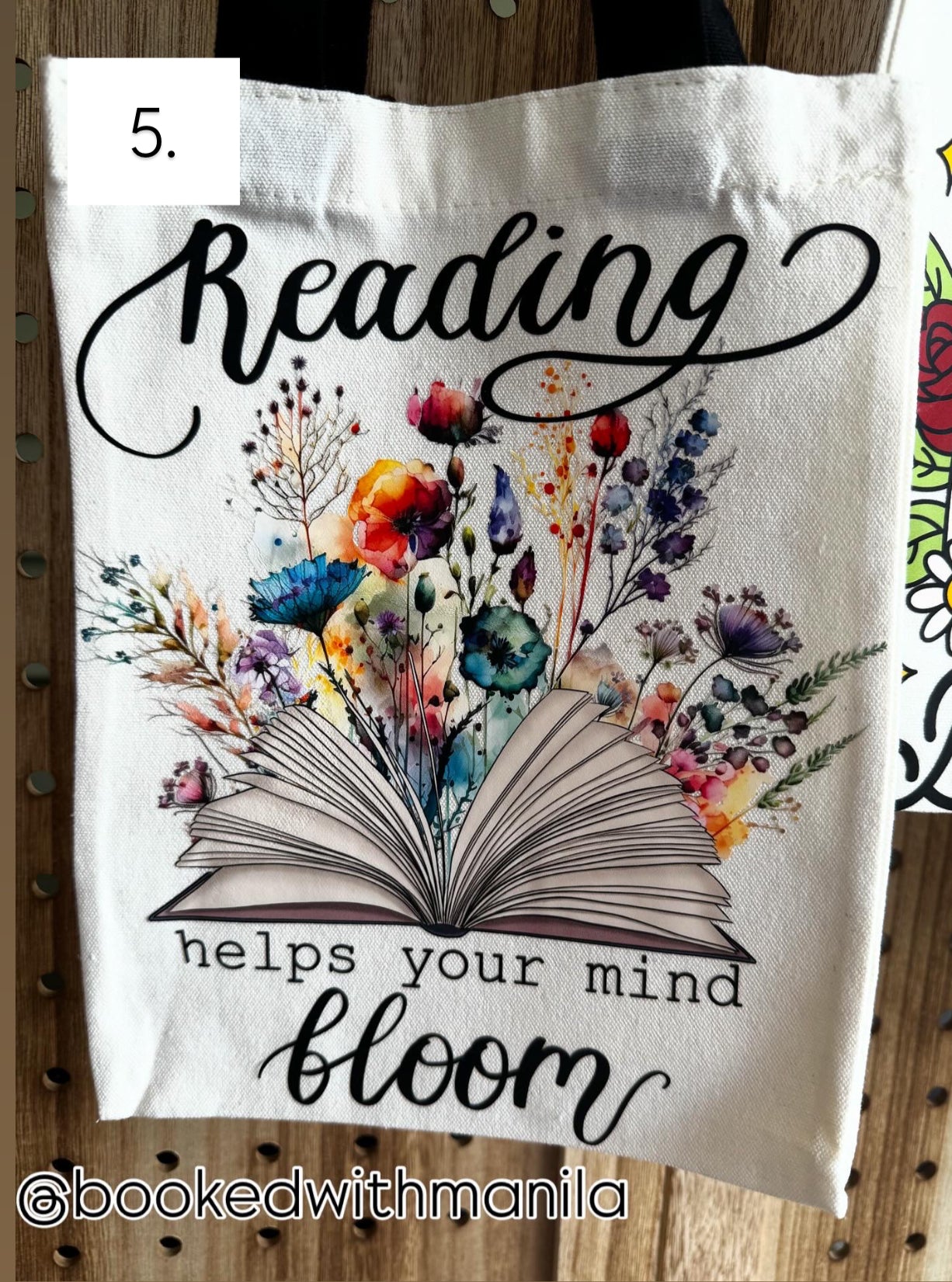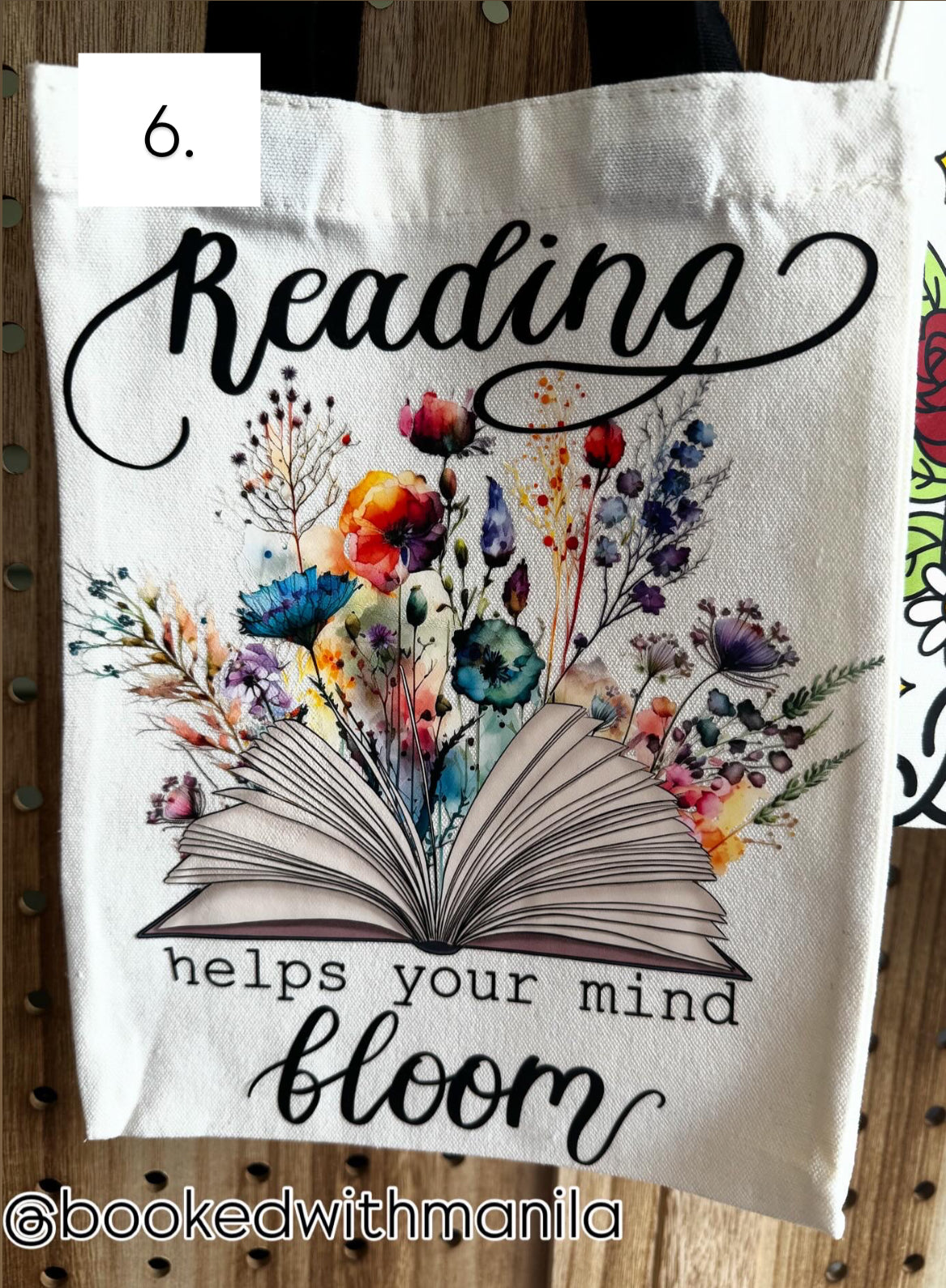 Beige Canvas bags with black handles perfect for any book lover. Each bag is unique with a one of one decal on the front of each bag to showcase your personality.